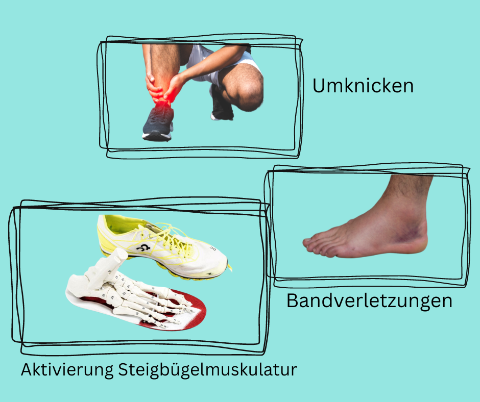 Hier kommt ein ganz wichtiger Faktor zum Tragen, nämlich die Unterstützung der sprunggelenksnahen Muskelgruppen, die den Fussaussenrand nach oben ziehen.